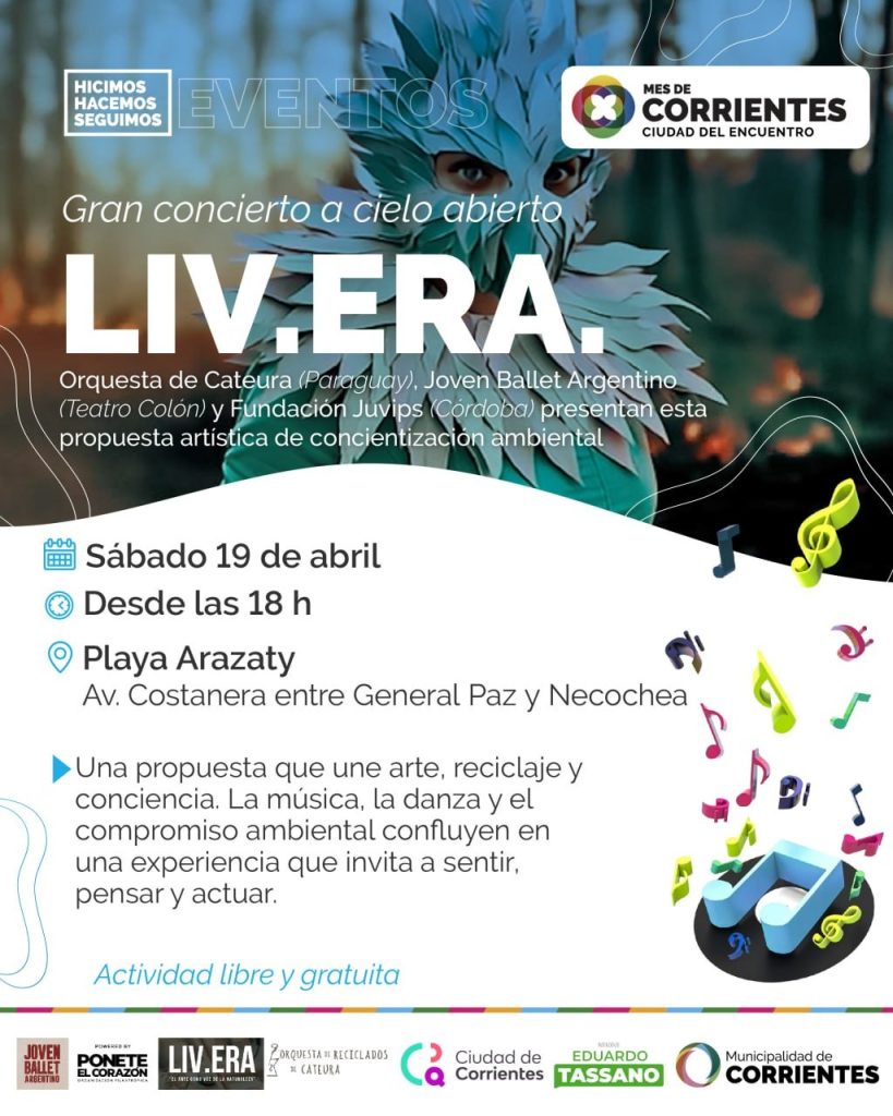 Con el acompañamiento de la Municipalidad, la ciudad será el escenario de LIV.ERA, un espectáculo artístico y ambiental. La organización filantrópica “Ponete el Corazón” propone por medio de este evento, reconocer al arte como un lenguaje poderoso, capaz de conmover e inspirar acción en defensa de la vida en el planeta.