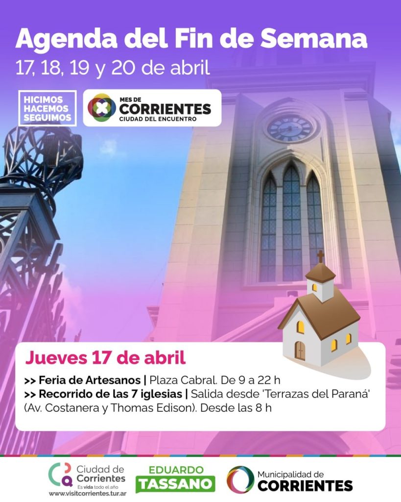 El Jueves Santo se realizará el habitual “Recorrido de las 7 Iglesias” en el marco del Mes de Corrientes para turistas y vecinos de la ciudad.  Desde las 8 se concentrarán en Terrazas del Paraná (Av. Costanera Gral. San Martin y Tomas Edison). De allí se recorrerán las iglesias: Jesús de Nazareno, Santísima Cruz de los Milagros, San Francisco Solano, Nuestra Señora de la Merced, María Auxiliadora, Santa Rita, Catedral “Nuestra Señora del Rosario”.  Inscripción: bit.ly/Recorrido7lglesias25