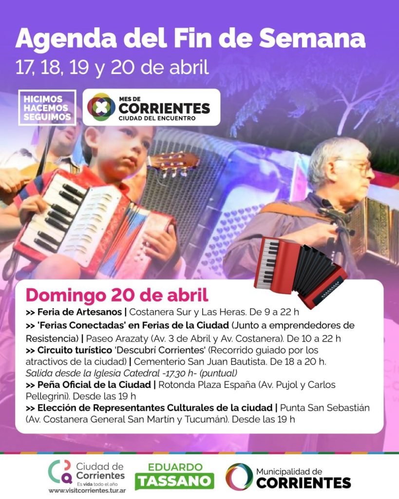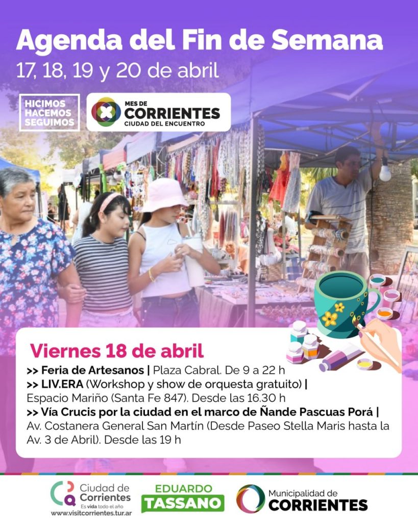Durante Semana Santa, la Municipalidad de Corrientes ofrecerá una agenda colmada de actividades para toda la familia: recorridos históricos y religiosos, ferias de emprendedores y artesanos, espectáculo de orquestas, peña chamamecera, Arte lteva, experiencias gastronómicas, propuestas ecológicas, entre muchas otras actividades gratuitas y al aire libre. Una oportunidad única para vivir la ciudad desde su tradición, creatividad e identidad.