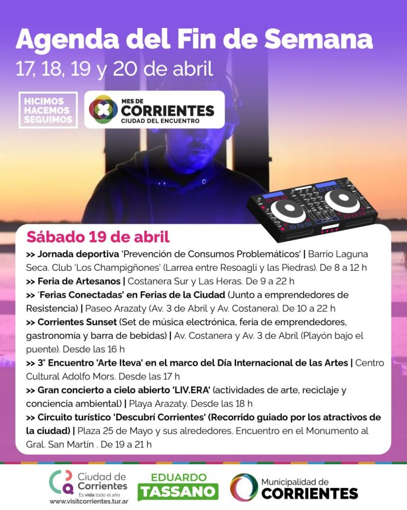 Desde las 16, habrá un set de música electrónica en el esperado Corrientes Sunset, en Av. Costanera y Av. 3 de Abril, más precisamente en el playón bajo el puente. Habrá además feria de emprendedores, gastronomía y barra de bebidas.